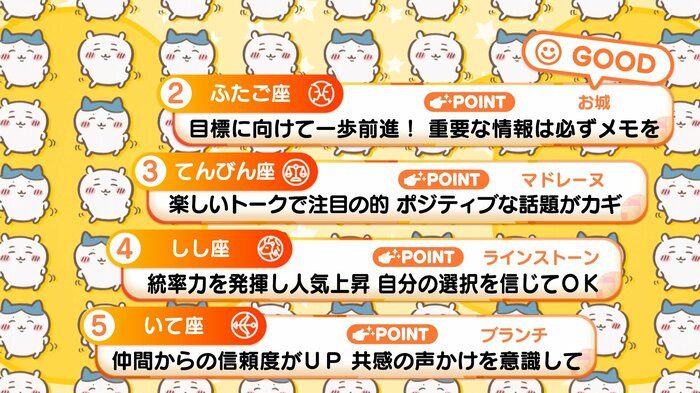 『めざましテレビ』で放送中の「ちいかわ占い」 テレビ放送がない日はお休みで、月~土:朝7時以降に更新予定です。