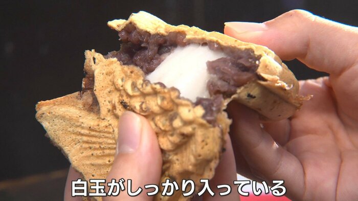 皮がパリパリ!薄い皮の中にあんこがぎっしりつまっているんですけど、白玉が結構しっかり入っているんですよ!おいしいですね。