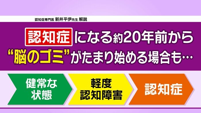 注意すべきなのは、「物忘れ」と「認知症」の間にある「軽度認知障害」の段階。アルツハイマー型認知症の場合、認知症になる20年前から脳に「ゴミ」のようなものが溜まっていくのだといいます。