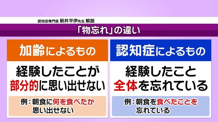 新井先生は「物忘れ」と「認知症」の違いも紹介。「別の用事を済ませたらやるべきことを忘れた」「人の名前が出てこない」などは、基本的には「物忘れ」に分類されるといいます。