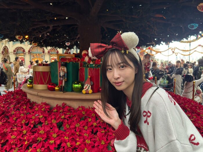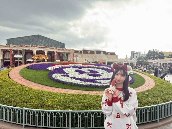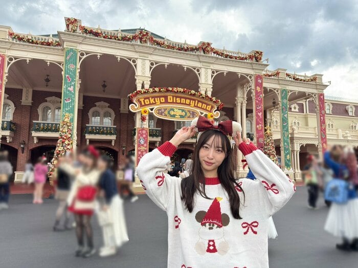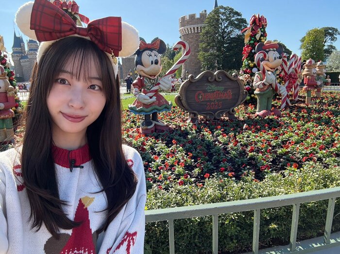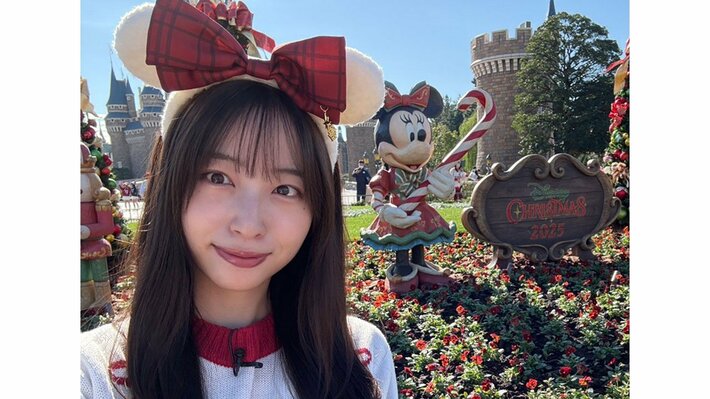 林キャスターは「うわー!可愛い!クリスマス一色です!ミッキーとミニーはパレードと同じコスチュームを着ていてフォトスポットにもぴったりです」と、にっこり笑顔で記念撮影を楽しんでいました。