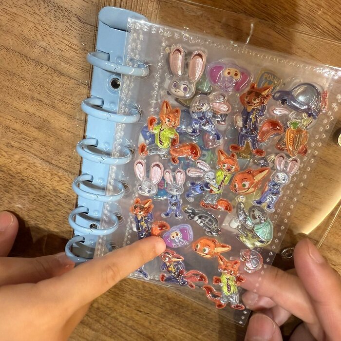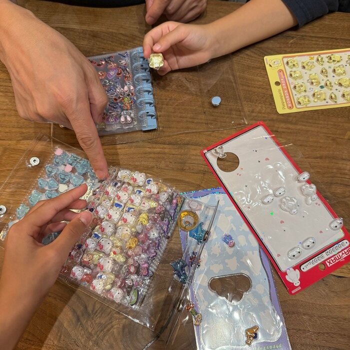 別のショットでは、テーブルの上にポムポムプリンやベイマックスなどのシールを広げていて、すっかり夢中!
