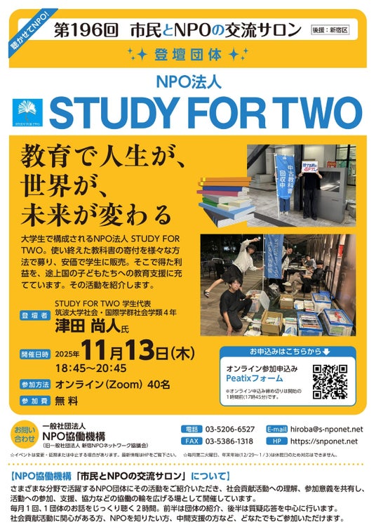 【第196回 市民とNPOの交流サロン(オンラインイベント)】(登壇団体:NPO法人 STUDY FOR TWO)を11月13日(木)に開催します!絶賛、参加者募集中です!!