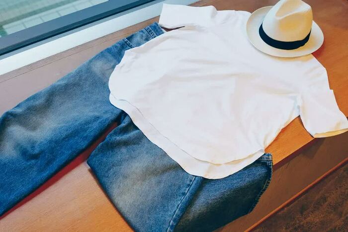 デニムも形がいいなと思って、色違いで黒も買いました。この帽子も今年購入したものですね。白い帽子は前から欲しくて。白Tシャツだけだと寂しいときにかぶると、ちょっと気分が上がります。