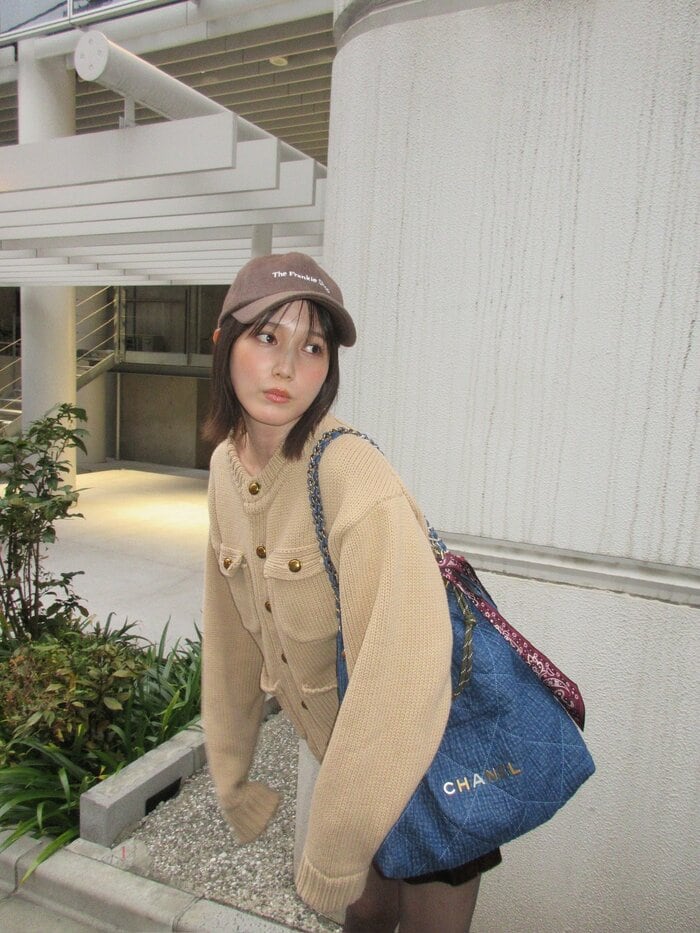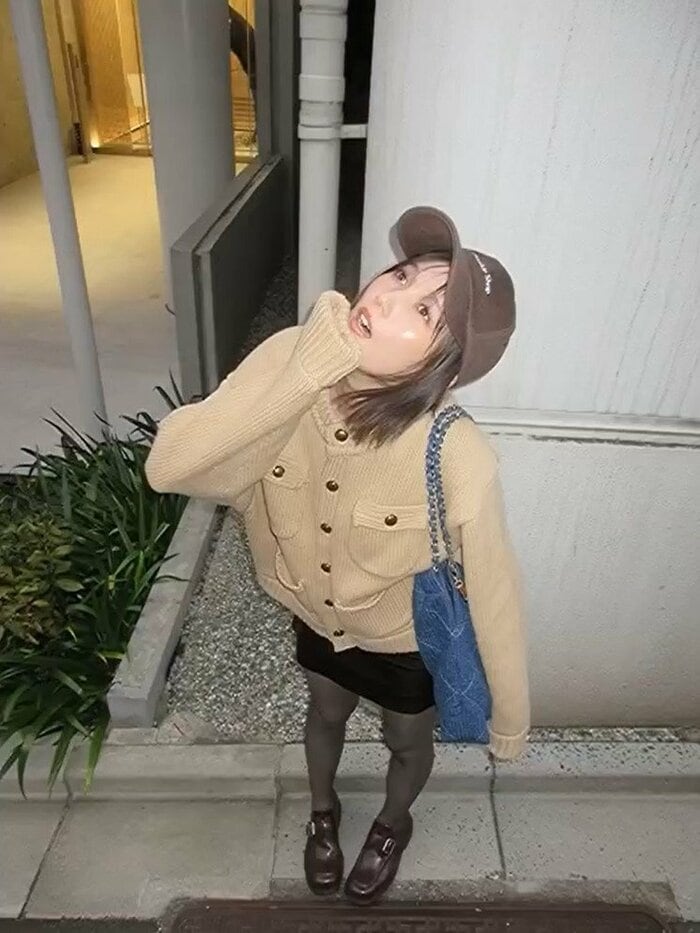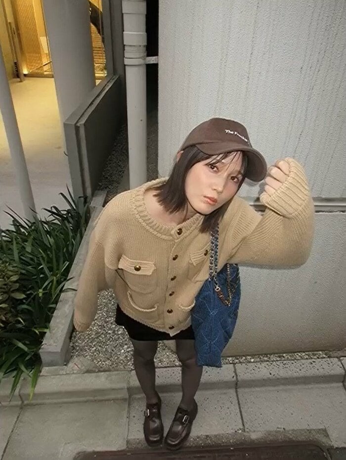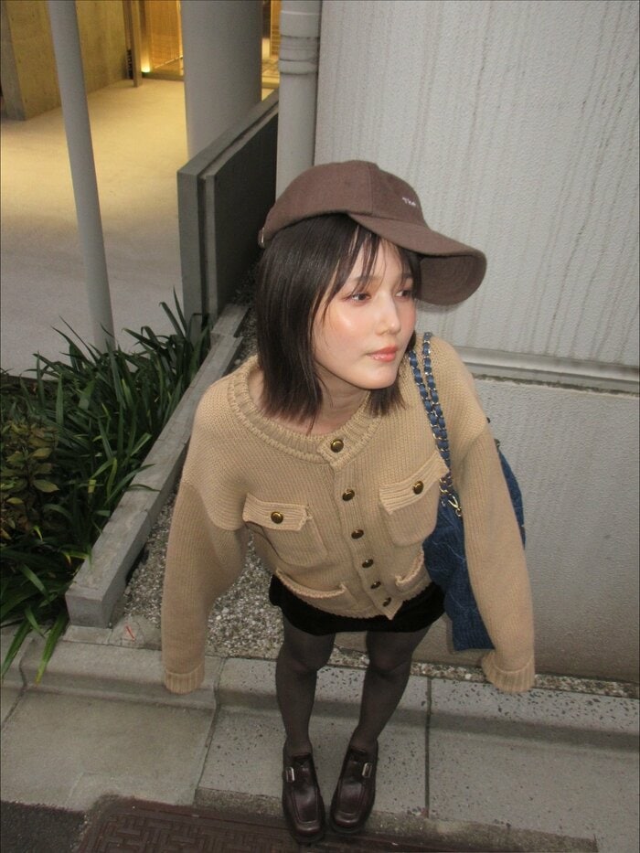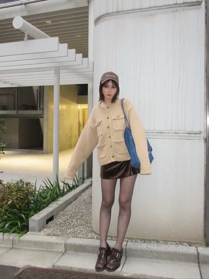 引きで撮影されたカットを見ると、ベージュのカーディガンにブラウンのミニスカートを合わせたコーデになっていることが分かります。