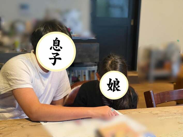 その写真を見てみると、長男と長女が並んで椅子に座り、机に向かっている姿が。