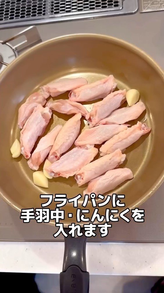 ニンニクは半分に切ってニンニクの芽を取り除き、手羽中と一緒にフライパンに入れます。