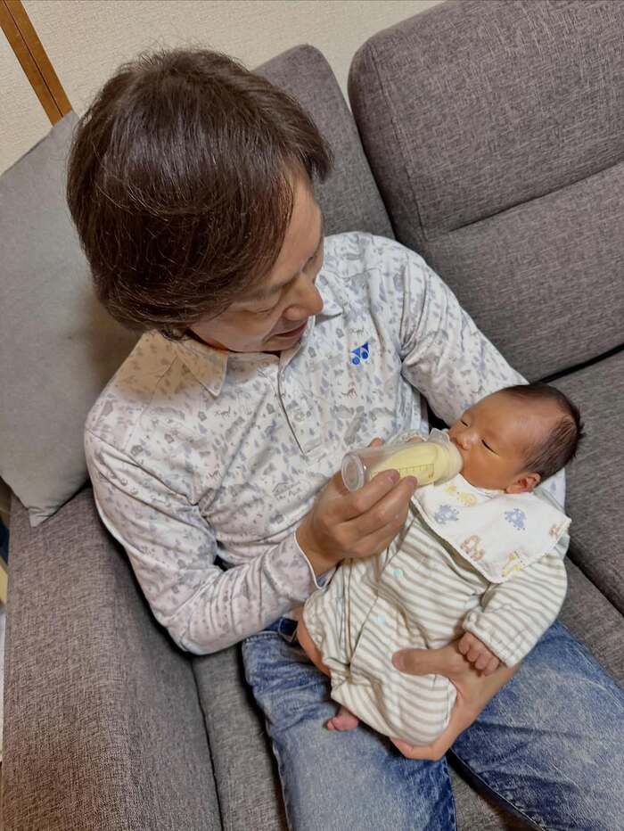 そして公開されたのが、佐藤さんが「初孫に初ミルク」をあげる姿。