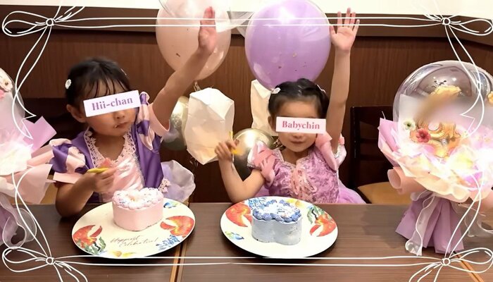 ホイップクリームやカラースプレーなどで豪華に飾られていて、そばには「HAPPY BIRTHDAY」や2人の年齢を表す「4」の数字が書かれたカードも置かれています。