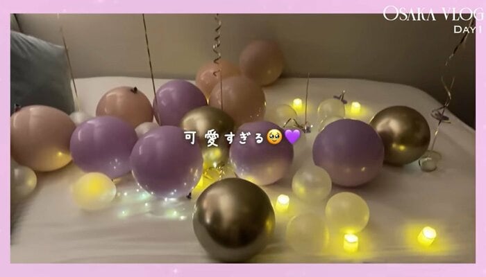 室内は、パープルやゴールドなど大量の風船や、温かな光がともったライトなどで豪華に装飾がされていて、サプライズで2人をお出迎え!
