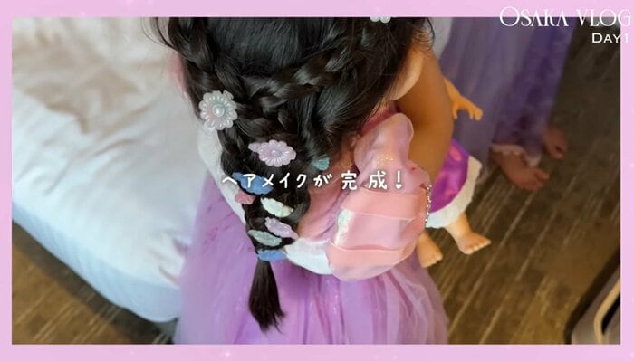 三つ編みや編み込みでかわいくセットした髪の毛には、花モチーフの髪飾りをたくさんつけ、ディズニープリンセスの「ラプンツェル」のようなスタイルに。