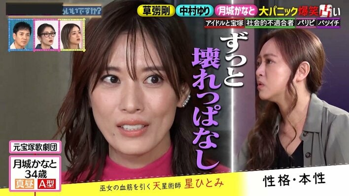 星さんは、月城さんの手相を見ると「感情と精神が不安定。結構ボロボロ。(心の)バネが壊れている」と診断し、月城さん自身も「ずっと壊れっぱなしです」と、うなずきました。