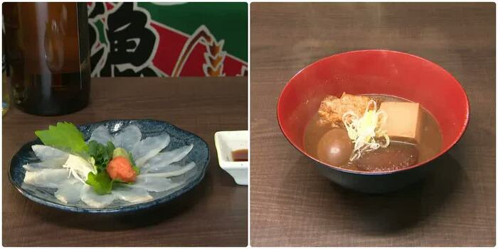 小池栄子が来店したのは、絶品の居酒屋メニューをリーズナブルに味わえる青物横丁を代表するお店で、サラリーマンやOLで常ににぎわっている超駅近の人気大衆居酒屋「磯平」。中でも破格なのが、ふぐの薄造り(390円)だ。ほか、赤味噌とデミグラスソースで味付けした社長(牛もつ煮込み/500円)も人気。もつは、巾着の中に入っているという、このお店ならではの一品。ビール(390円)で乾杯。※価格は、すべて税別。