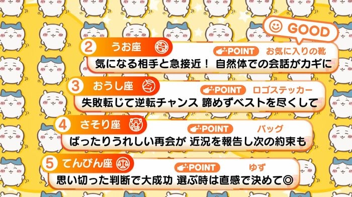 『めざましテレビ』で放送中の「ちいかわ占い」 テレビ放送がない日はお休みで、月~土:朝7時以降に更新予定です。