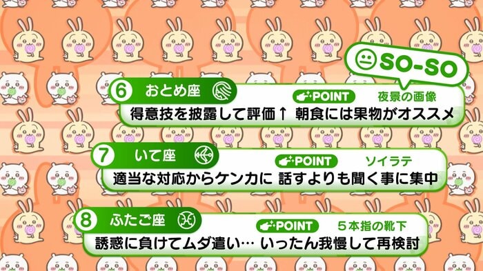 『めざましテレビ』で放送中の「ちいかわ占い」 テレビ放送がない日はお休みで、月~土:朝7時以降に更新予定です。