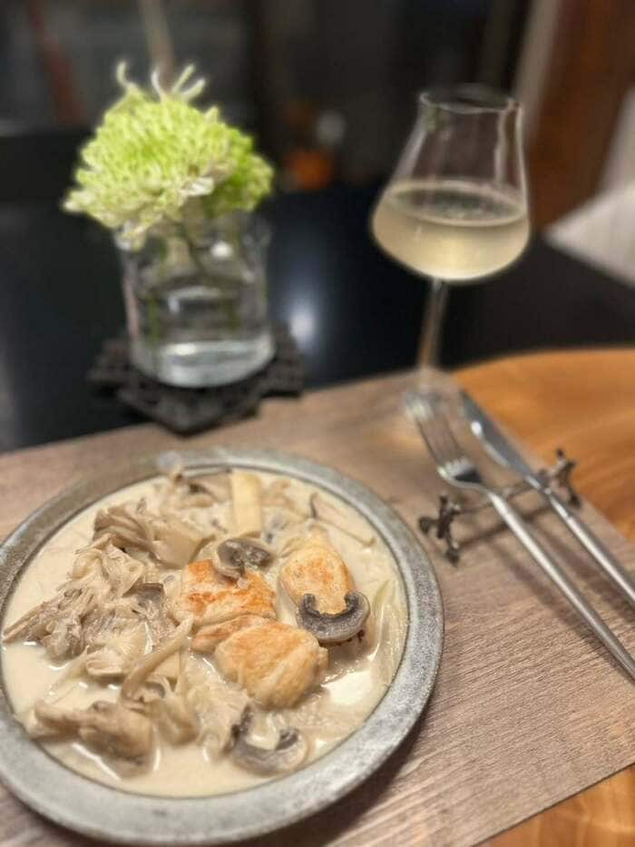 さらに、「生クリームがきれていたので豆乳、牛乳にバターをほんのり効かせての代用なので少しシャバシャバしていますが、キーンと冷えた白ワインに良く合います」と、切れていた材料を代用品で置き換え、工夫を凝らしたことも明かしています。