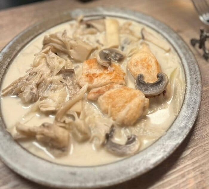 アンティークなシルバーのお皿には、マッシュルームやまいたけなど秋を感じる食材や、こんがりと焼き目のついた鶏肉がたっぷり入ったクリームソース煮が盛られています。