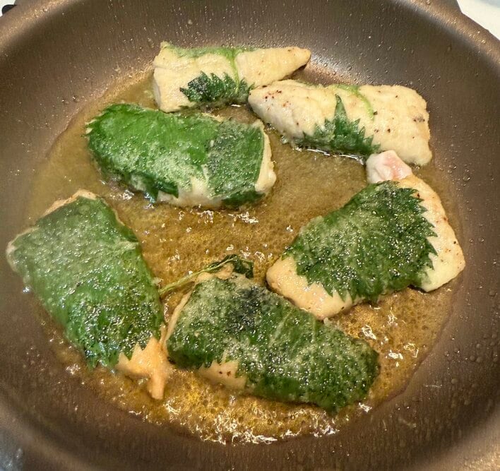 こちらは、やす子さんの「昨日の夜ご飯」だそうで、大葉がぐるりと巻かれた大きな鶏肉が、フライパンの中でジュージューと焼かれています。