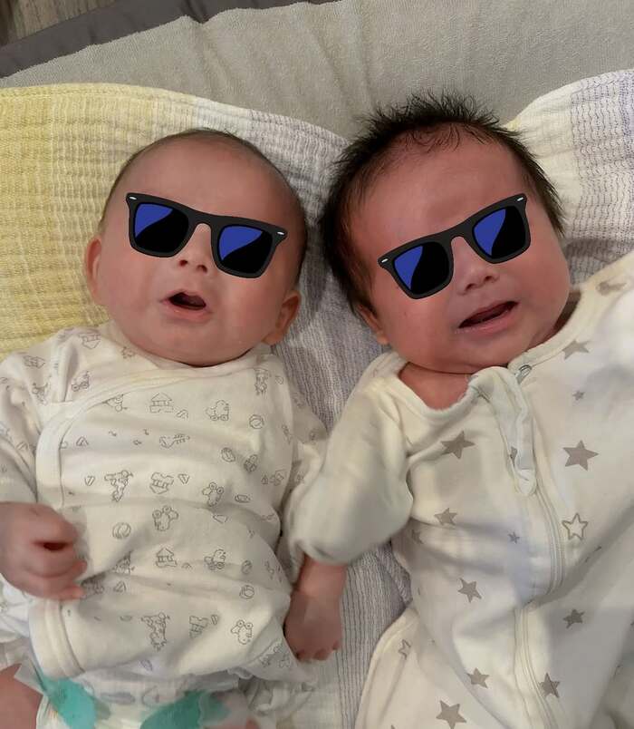 “ファイティングポーズ”をしながら横になる弟くんの姿など、双子のユニークな寝転びショットをたっぷりと披露。