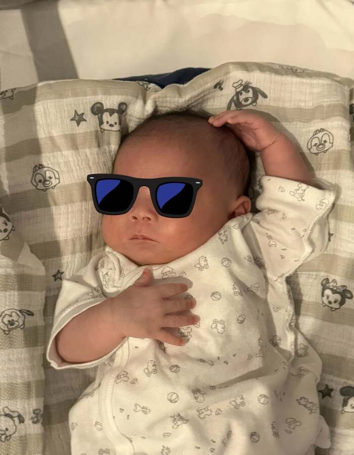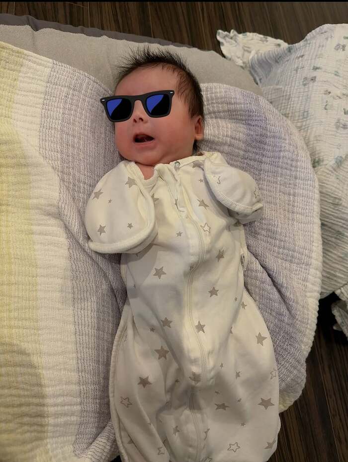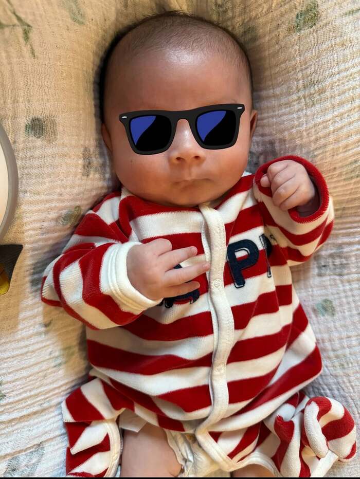他にも、星柄のスワドルに身を包み、大きな口を開けて横になるお兄ちゃんの姿や・・・