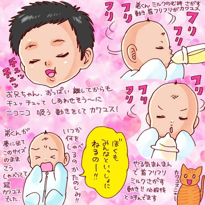 弟くんについては、「ミルク飲むと時 さがす動き 首フリフリがカワユス」というコメントとともに、ミルクの入った哺乳瓶を探す姿が描かれました。つり眉で唇をとがらせた弟くんの表情から、必死にミルクを探すかわいらしい状況が目に浮かびます。