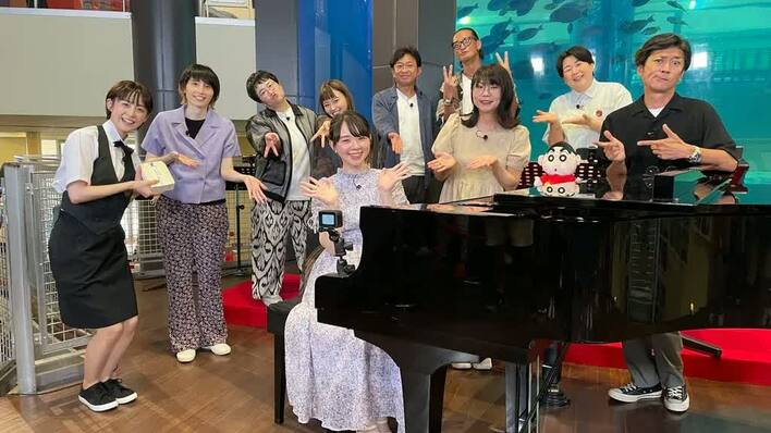 ベイサイドプレイス博多へ移動すると、ピアノを弾きながらどんな曲でもクレヨンしんちゃんの声で歌ってしまう超人気ピアニスト・まなまるさんがサプライズで登場。