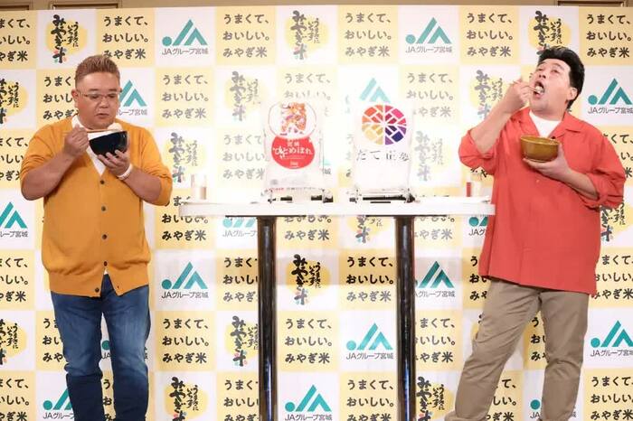 イベントでは、2人は宮城県産の銘柄「ひとめぼれ」と「だて正夢」を試食。