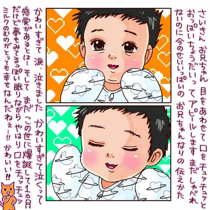 中川さんは、「目をあわせて 口をチュッチュッと おっぱいちょうだいってアピールします」「せいいっぱいの お兄ちゃんのなりの伝えかた かわいすぎて 涙、泣きました」と我が子にデレデレな様子。続けて、「親バカになってしまうけどみんな親バカになっちゃうよねきっと!その気持ちの持って行き先が 絵日記になってます」とつづりました。