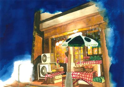創業当初の1号店の様子。店内が狭いため外にまで所狭しと食材が並べられている。