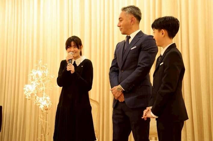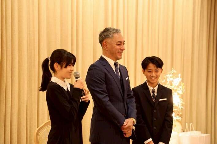 フォーマルな黒いワンピース姿の麗禾さんが、マイクを両手で握りしめて、はにかみながらあいさつをしています。そんな麗禾さんを、スーツ姿の新之助さんと共に隣に立つ市川さんが見守っています。