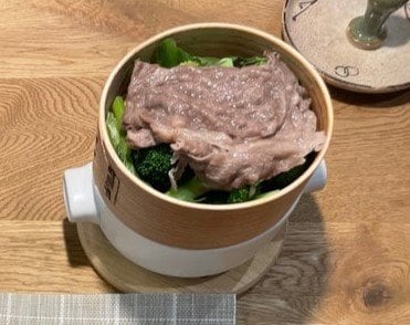 テーブルに置かれた蒸し器を見てみると、ブロッコリーなどの緑色野菜が敷き詰められ、その上にお肉が乗っています。