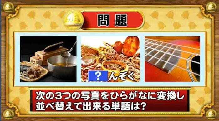 最初は「脳ミングアップクイズ」から、シャッフル写真の問題。次の3つの写真をひらがなに変換し、並べ替えて出来る単語は何でしょうか?