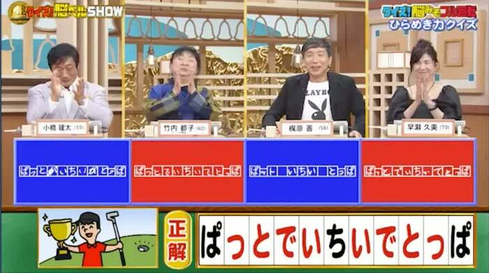 今回の解答者は、元プロレスラー・小橋建太さん(55)、芸人・竹内都子さん(60)、俳優・梶原善さん(56)、女優・早瀬久美さん(70)の4名です。