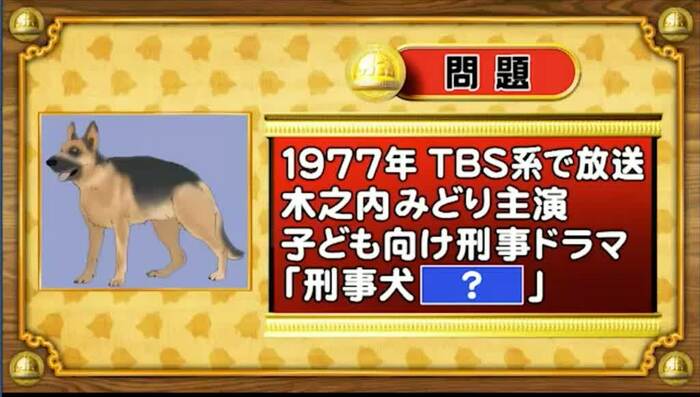 最後は、なつかしドラマの問題。今から45年前の1977年、TBS系で放送された、木之内みどりさん主演、子ども向け刑事ドラマのタイトルは『刑事犬[?]』?