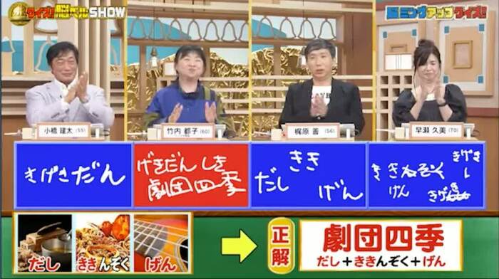 正解は「劇団四季(だし+きき+げん)」。竹内さんが見事正解!