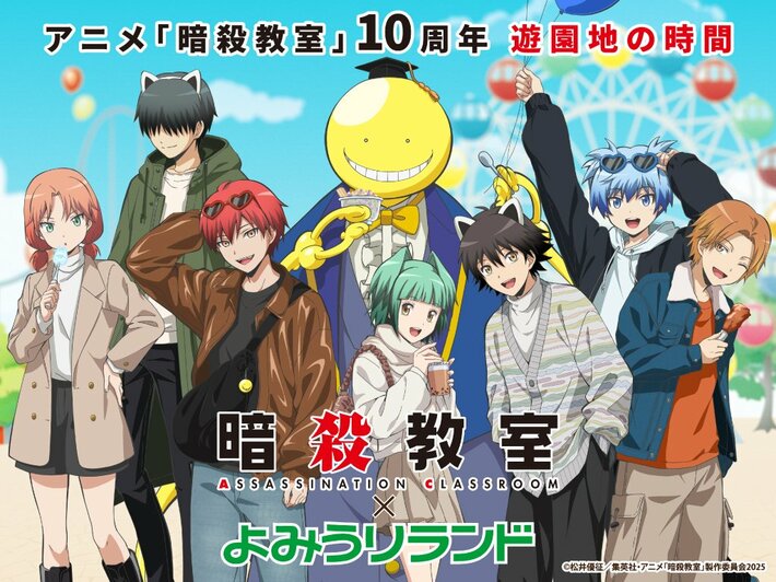 遊園地「よみうりランド」では、12月12日(金)~28日(日)の期間、今年アニメ化10周年を迎えた『暗殺教室』とのコラボイベントを開催します。8人のキャラクターたちがよみうりランドを楽しむ描き下ろしイラストを使用したグッズ販売や、キャラクターと撮影できるフォトスポットの展示を行います。その他にも「殺せんせー」「潮田渚」「赤羽業」の録り下ろしボイスによる園内放送やアトラクションなど、遊園地ならではのコラボ企画が盛りだくさんです。詳細は決まり次第、特設サイトにて公開します。