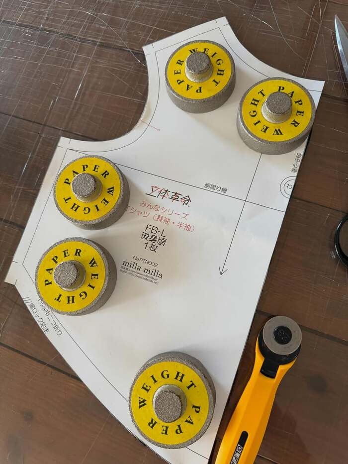 そばには、オレンジ色のカッターも置かれています。中央に「FB-L」と書かれた、フレンチ・ブルドッグ LサイズのTシャツを作るようです。