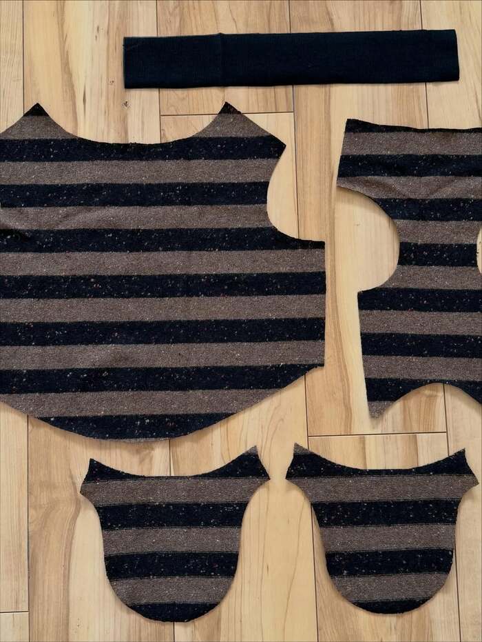 黒と茶色のしま模様の布を、型紙に合わせて切り抜きます。準備した一番大きな背中部分と、お腹部分、Tシャツになるように袖部分を2枚、さらに首元に合わせる黒地の帯状のリブといった5パーツが並べられています。