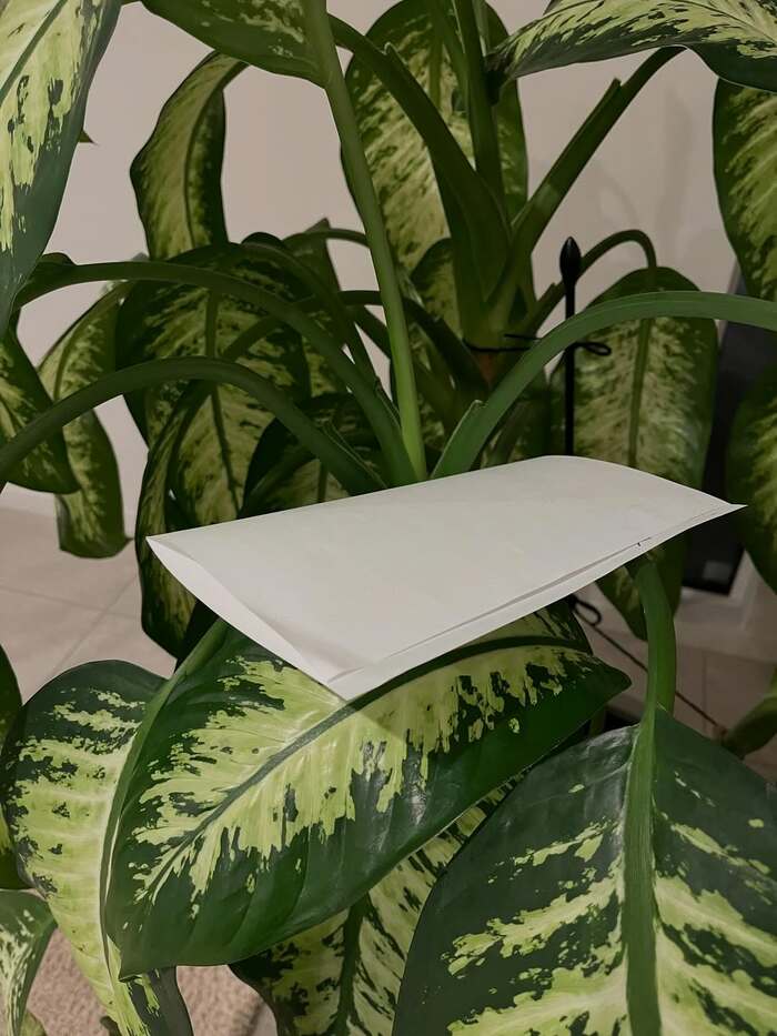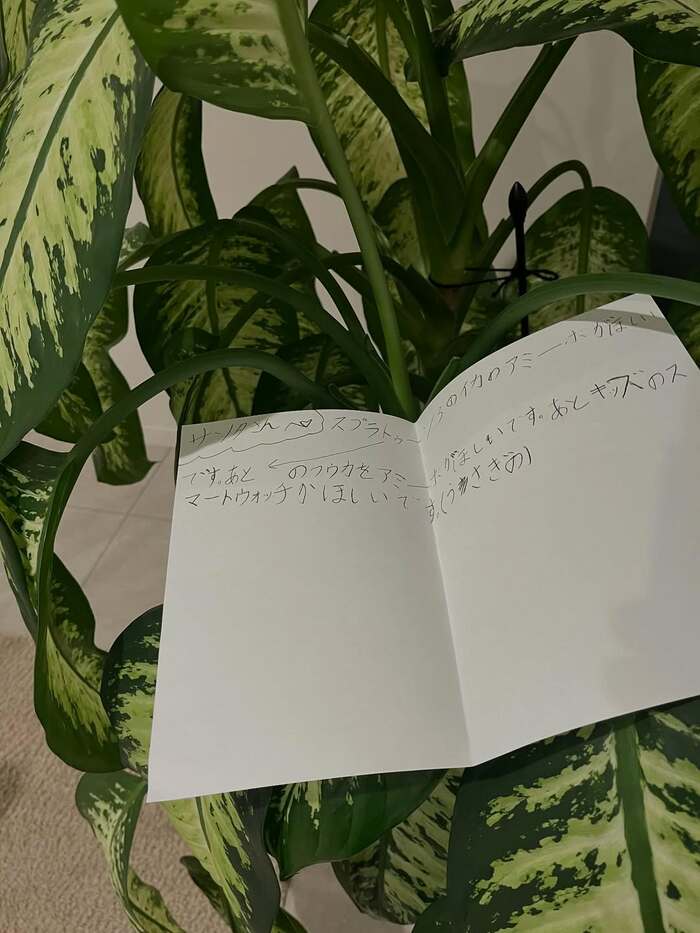 公開された写真を見てみると、いつもクリスマスツリーを飾っている場所には普段、観葉植物が置いてあるようで、その植物の葉っぱの上には折りたたまれた一通の手紙が絶妙なバランスを保った状態で置かれているのが分かります。