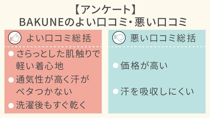実際の口コミを探るべく、BAKUNEを実際に着用したことがある人にアンケートを取りました。よい口コミ・悪い口コミをピックアップして紹介します。