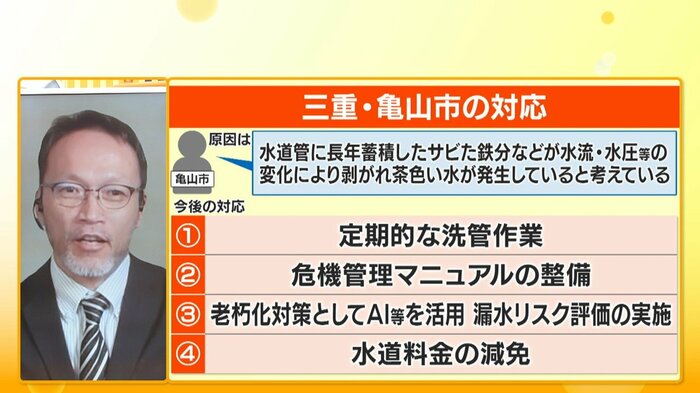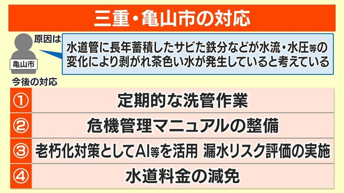 濁った水が出ている原因について、亀山市は「現在調査中であり、直接的な原因は、水道管に長年蓄積したサビた鉄分等が、何らかの水流水圧等の変化により、はく離したためと考えております」としています。