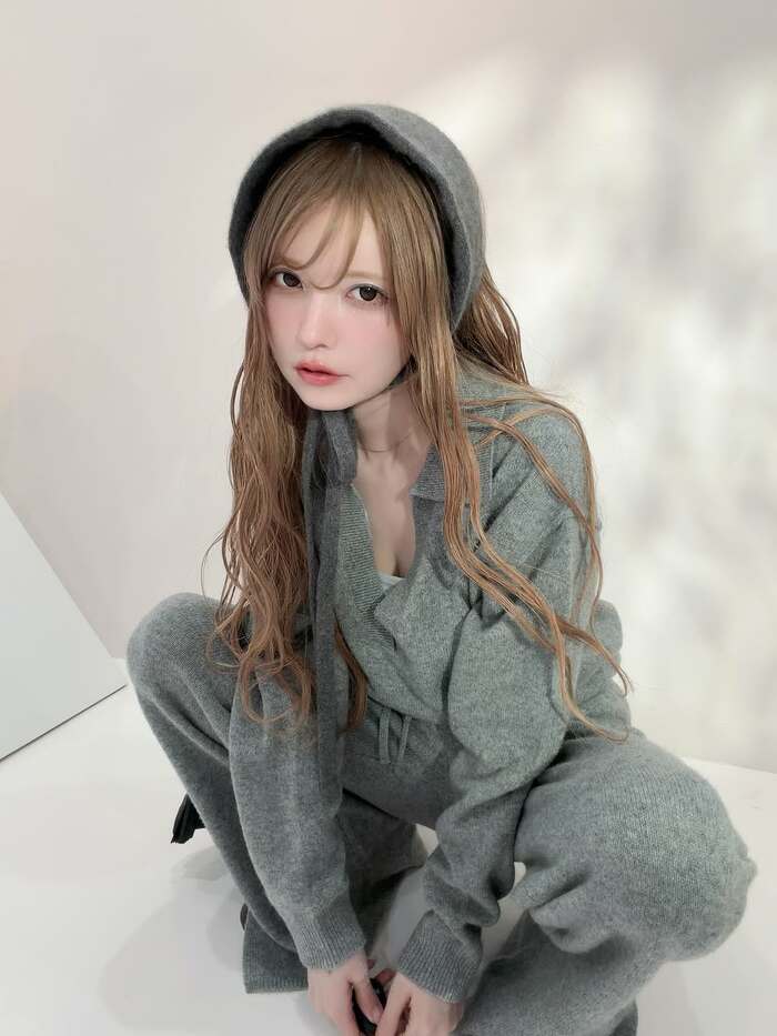 ゆったりとしたグレーのニットにグレーのパンツ、グレーのバブーシュカをかぶった、かわいらしいスタイルです。襟付きのニットからは、美しいデコルテがチラリとのぞきます。