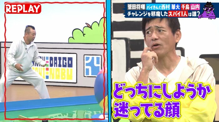 ここでは、最後の成功寸前、ただボールを見つめるだけだった西村さんに対して「フリーズしてた」(大悟)、「(邪魔するか)迷ってる顔だった」(華丸)と、疑惑の声があがりました。