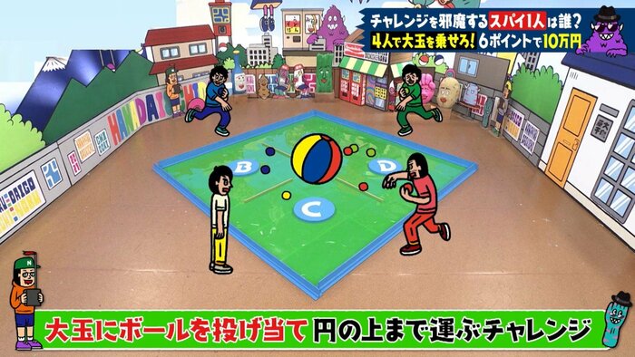 4人1組で大玉に小さなボールを投げ当て、4つの円の上まで運ぶチャレンジ。円の上で5秒間キープで1ポイント獲得。前半と後半で合計6ポイント獲得できれば成功です。