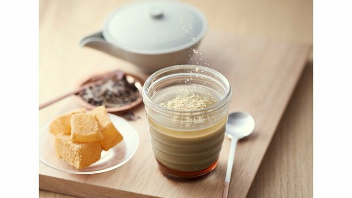 とろりと甘い黒糖蜜ソース、香ばしいほうじ茶を使用したなめらかプリンに、天面にはわらび餠を合わせました。別添の国産きな粉をふりかければ、まるで「和」のプリンパフェのような贅沢なプリンに。