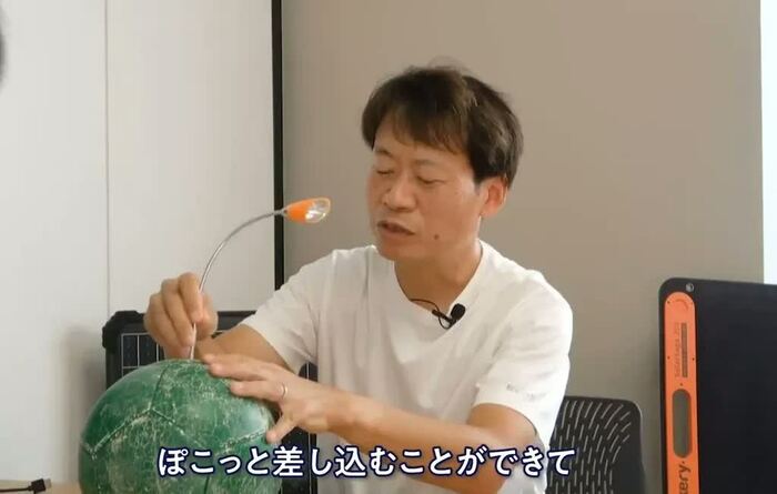 井手迫さんが普段使っているものとして最初に取り出したのは、サッカーボール。触った感じは普通のボールですが、「発電するサッカーボール」です。