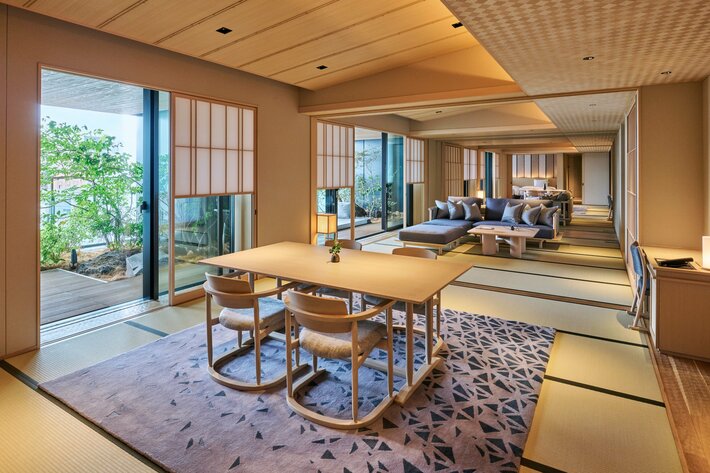 すべての客室に熱海の天然温泉を備え、日本の美意識と香りに包まれた空間をご用意しております。庭には四季を彩る花木が揺れ、外気を取り込んだ開放的な空間・日本のしつらえに包まれる静謐な空間、そのどちらも味わうことができます。たっぷりの湯に身を包み、心身ともにゆるやかにほどける滞在をご堪能ください。