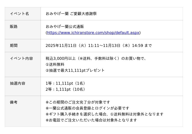 株式会社一蘭は、11月11日より『おみやげ一蘭 ご愛顧大感謝祭』を開催いたします。