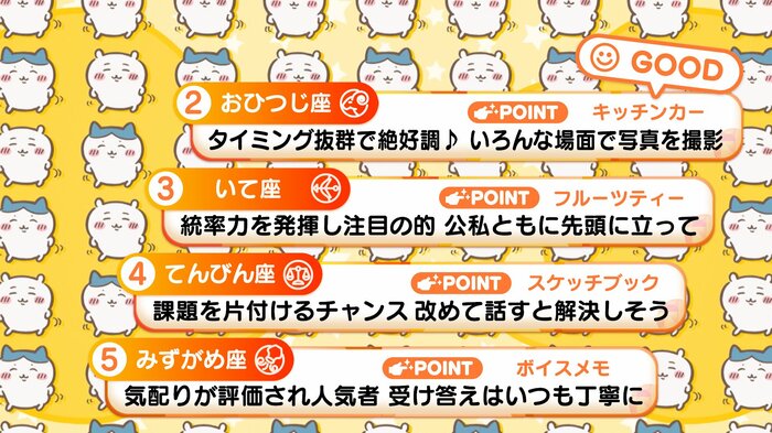 『めざましテレビ』で放送中の「ちいかわ占い」 テレビ放送がない日はお休みで、月~土:朝7時以降に更新予定です。