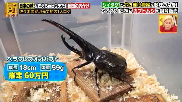 1万頭の中で、最も高額なのが、18cmもの長さの角を持つ「ヘラクレスオオカブト」。その値段は、およそ60万円。